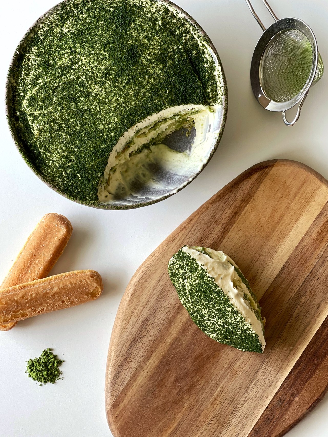 - Dip ladyfinger biscuits into your matcha and layer at the bottom of your serving container.